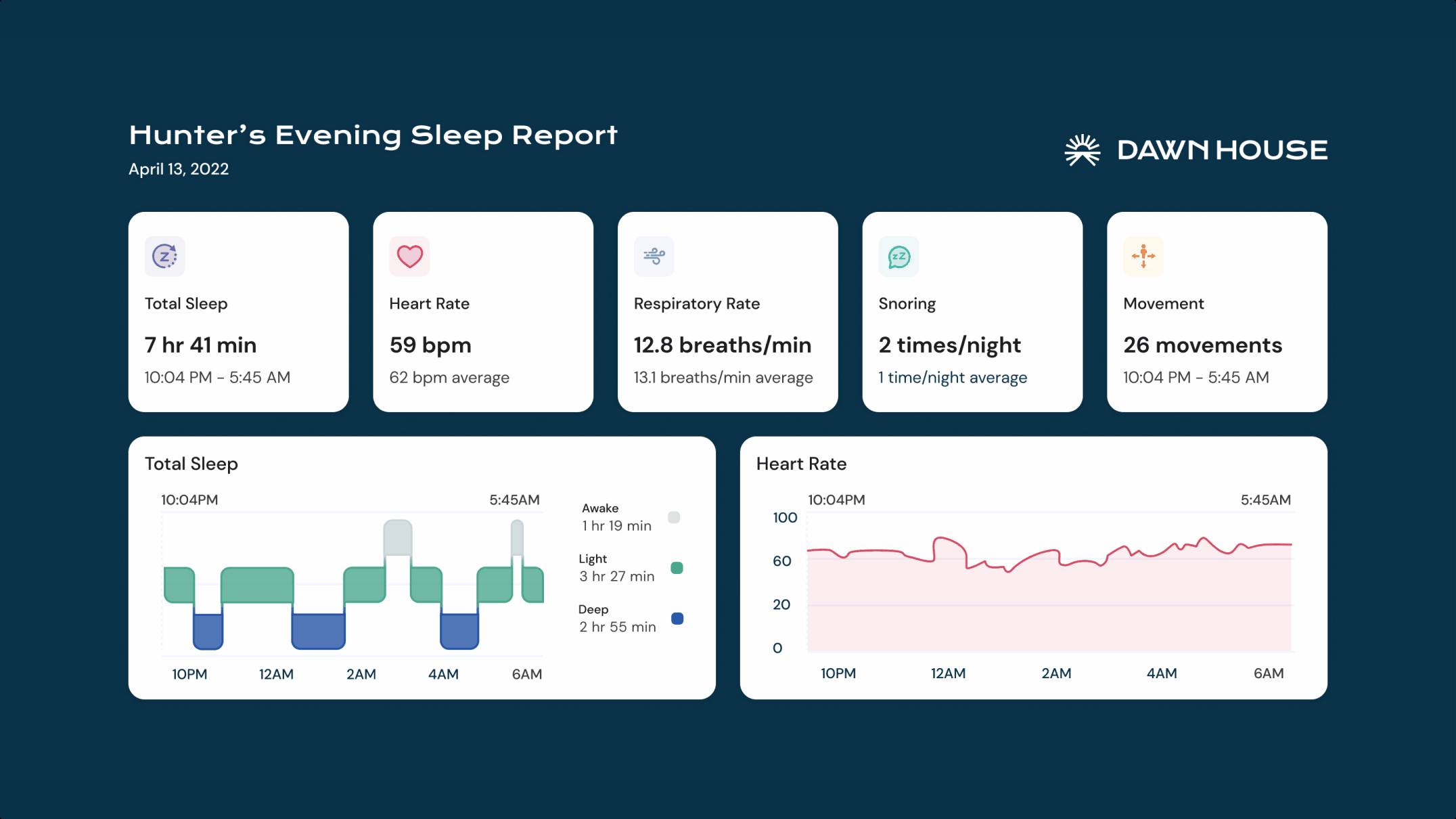 The Dawn House App app allows you to view sleep reports and health metrics in one place. Receive personalized suggestions to improve sleep quality. Share your sleep report with a physician or loved one.